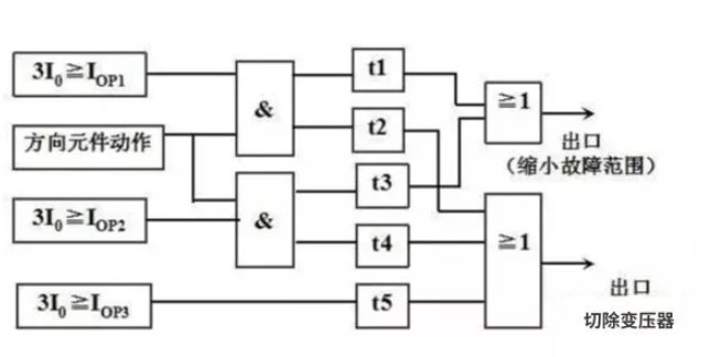 直接接地電壓為110kV及以上中性點的變壓器,應在大電流接地系統(tǒng)側設置零序電流保護。變壓器側直接接地的變壓器,零序電流保護應帶方向,方向應指向各側母線。零序電流保護的原理與線路零序保護相似,可參考第30期。零序電流可取自中性點CT二次電流或本側CT二次三相電流。接入方向元件的零序電壓可取自本側PT開口的三角電壓或本側的二次三相電壓。微機保護裝置主要采用自產方式。對于大型三繞組變壓器,零序電流保護可采用三段式。I段II段帶方向,II段無方向。每段一般有兩級延遲,以較短的延遲縮小故障范圍(跳母聯(lián)或條本側開關),以較長的延遲切除變壓器(跳三側開關)。根據實際情況確定具體的保護配置。如圖所示,在零序方向電流保護I段或II段后,首先通過短延時t1或t3跳母聯(lián)或跳本側開關,以縮小故障影響范圍。如果故障量仍然存在,則通過長延時t2或t4跳三側開關切斷變壓器。無方向的III段直接通過延遲切除變壓器。