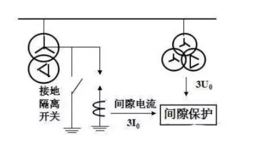 在變壓器中性點對地之間安裝擊穿間隙。接地隔離開關閉合時,變壓器直接接地,投入零序過流保護。接地隔離開關斷開時,變壓器通過間隙接地,投入間隙保護。