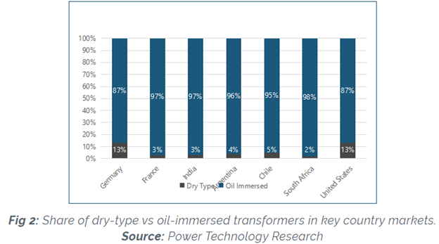據(jù)PTR統(tǒng)計(jì),從全球來看,92%的配電變壓器(按單位計(jì)算)是油浸變壓器,干式變壓器只占8%。世界主要國家的干式變壓器占有以下市場份額:德國13%,法國3%,印度3%,阿根廷4%,智利5%,南非2%,美國13%。