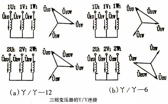 如下圖所示,原副邊繞組不僅為Y連接,而且原副邊以同極端為首端,從相量圖可以看出原副邊的電動勢為同相位,因此應(yīng)標(biāo)記為12,即將該連接標(biāo)記為Y/Y-12連接組。圖(b)中原用新標(biāo)準(zhǔn)(y、y0)表示。副邊的極性不同,所以在同相量圖上可以看到原副邊的180°相位差,所以應(yīng)該標(biāo)記為6,即這種連接方法成為Y/Y-6連接組(新標(biāo)準(zhǔn)用y、y6表示)。